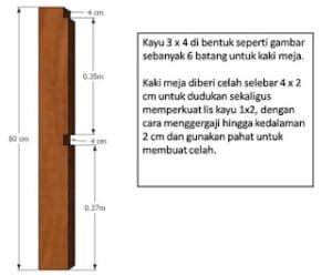 - Kayu 3 x 4: Potong sepanjang 80cm sebanyak 6 batang untuk kaki meja.